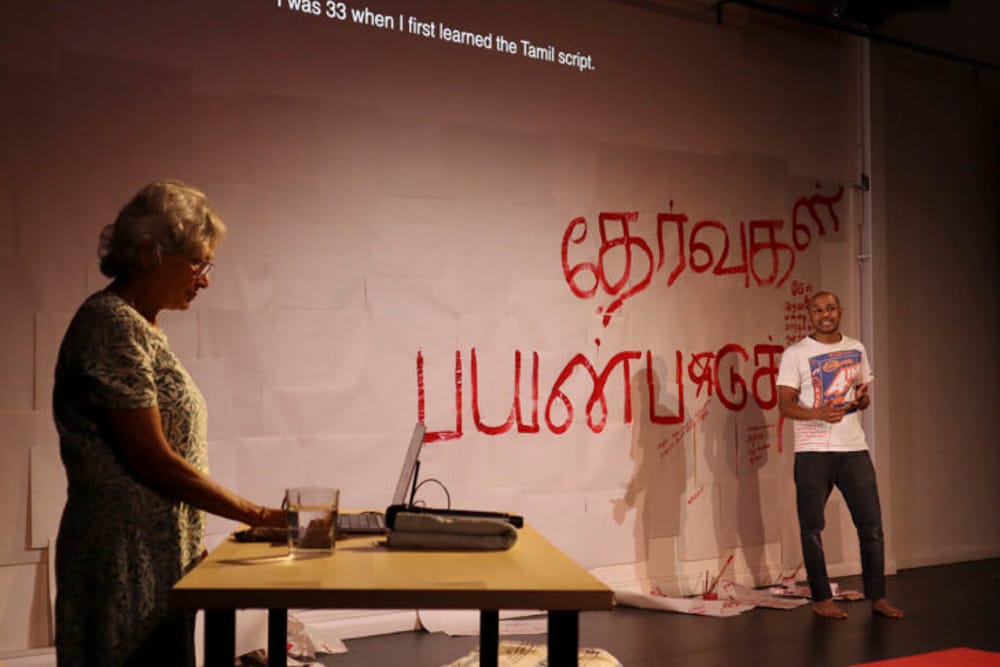 Op het podium speelt Ahilan de voorstelling volledig in het Tamil, met Engelse en Nederlandse boventiteling. Zijn moeder zit naast hem, corrigeert, ondersteunt en fungeert als taallerares en souffleur. Samen vertellen zij een verhaal dat niet alleen gaat over taal, maar ook over identiteit, herinnering en de breuklijnen die migratie en diaspora achterlaten.