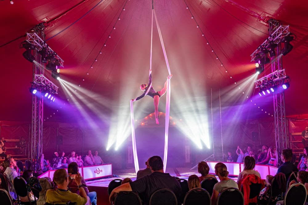 Een eigentijdse lichtshow begeleidde de circusvoorstelling, waardoor elke act nog indrukwekkender tot zijn recht kwam. De perfect getimede verlichting accentueerde de adembenemende stunts en zorgde voor een betoverende sfeer onder de grote circustent. Passende muziek vulde de lucht en bracht de voorstelling tot leven, waardoor het publiek werd meegevoerd in de magie van Circus Harlekino.