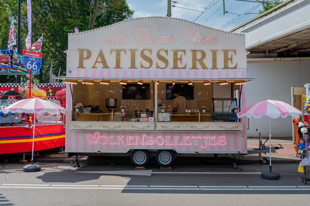 Bij de kermisattractie Pâtisserie La Vie en Rose koop je de heerlijkste Crepes en Wolkenbolletjes van de kermis.