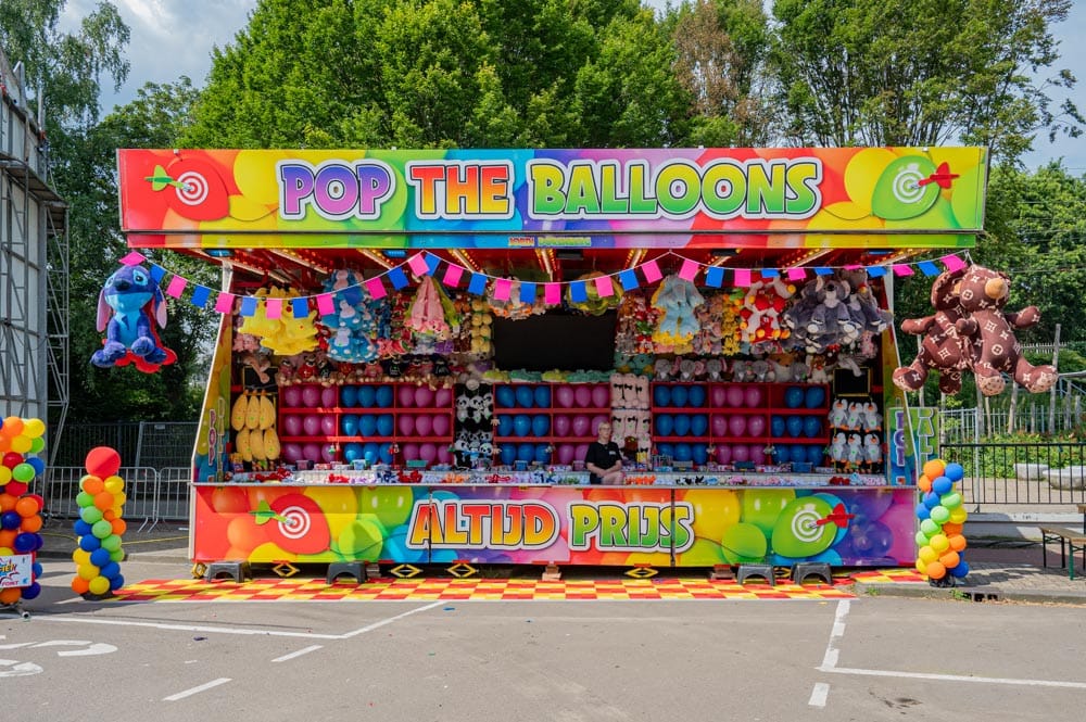 Deze kleurrijke kermisattractie daagt jong en oud uit. Gewapend met pijltjes of darts mik je op een muur vol ballonnen. Richt, gooi en hoor het knallende geluid van een raak schot!