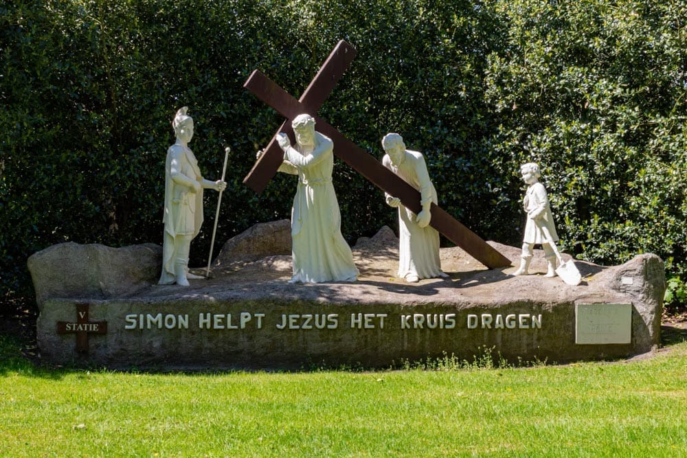 Het kunstwerk ‘Kruiswegstatie 5 Simon helpt Jezus het kruis dragen’ is gemaakt door Fa. P. Verbraak & Zonen in 1961. Het religieuze kunstwerk bevindt zich op het Heiligdom Peerke Donders in Tilburg-Noord. In dit beeld is de vijfde statie uitgebeeld van de veertien staties van de kruisweg. De veertien staties brengen de lijdensweg van Jezus in beeld. De kruisweg is bedoeld om stil te staan bij wat Jezus Christus heeft meegemaakt in zijn laatste uren van zijn leven op aarde.