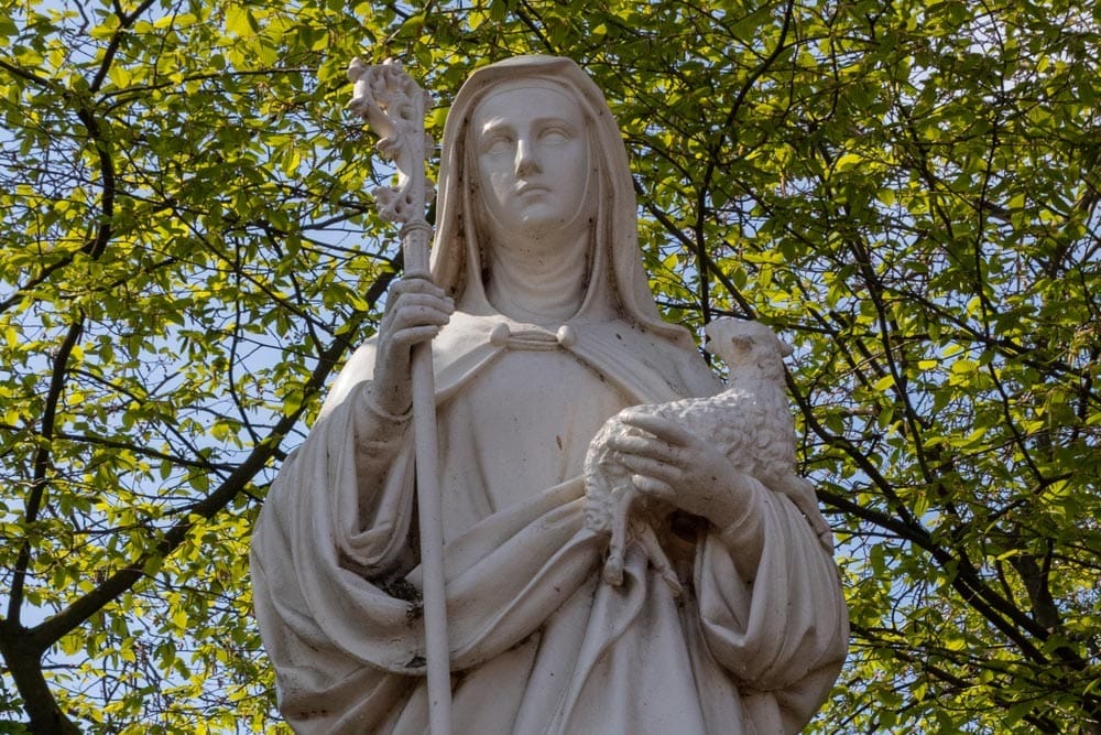 De heilige Agnes overleden in Rome op 21 januari 254 of 304 stierf als dertienjarige martelares voor het christelijk geloof. Agnes was slachtoffer van verkrachting en aan heidense goden gewijd. Toen zij naar de tempel van Minerva werd gebracht maakte zij een kruisteken en weigerde zich tegen God te keren. Vele mannen vroegen haar ten huwelijk, maar zij weigerde en zei dat ze al verloofd was met Jezus Christus. Zij werd vervolgens bedreigd en gemarteld en vond ten slotte de dood doordat haar een zwaard in de keel gestoken werd. Na deze deze gebeurtenis werd ze na acht dagen gezien in een gouden kleed met een verlovingsring van Jezus Christus en aan haar rechterzijde een wit lam. Het witte lammetje verwijst naar zichzelf als ‘bloedoffer’. Heilige Agnes is de beschermheilige van de verloofde paren, van de kuisheid, van de jonge meisjes en maagden en van de slachtoffers van verkrachting.
