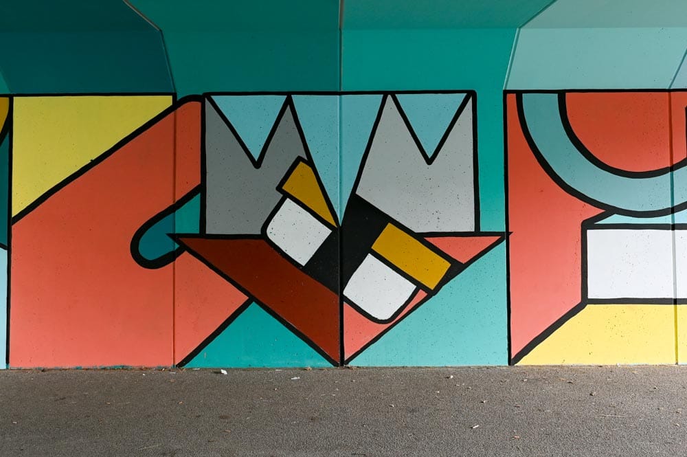 De muurschildering, genaamd ‘Streetart Stappegoor tunnel’, is een meesterwerk van abstracte en driedimensionale vormen, geschilderd in een palet van pastelachtige kleuren. De artistieke flair van Aziz Lessy komt tot leven op zowel de muren als het plafond van de fietstunnel, waardoor een betoverende en levendige sfeer ontstaat.