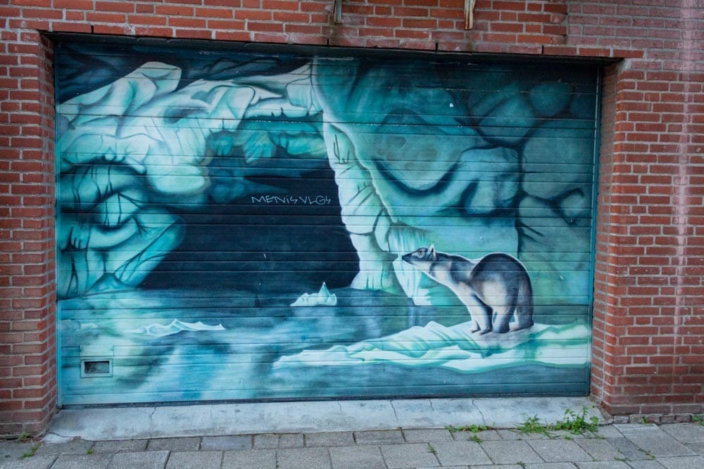 Streetart Ijsbeer Nieuwstraat is te vinden in de Nieuwstraat in Tilburg en is van de hand van Erik Veldmeijer en is in 2008 geschilderd op een garagedeur in de straat. Het werk toont een ijsbeer op een ijsschots.