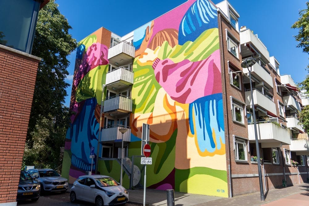 Hedy Tjin, de artistieke geest achter dit werk, heeft ook gekozen voor frisse kleuren die harmoniëren met de omgeving en het gebouw. De kleuren zijn geïnspireerd op de natuur, zoals de bomen, de luifels en de blauwe lucht. Deze keuze benadrukt de boodschap van inclusie en verbinding, waarbij kunst een brug slaat naar de werkelijkheid van de voorbijganger.