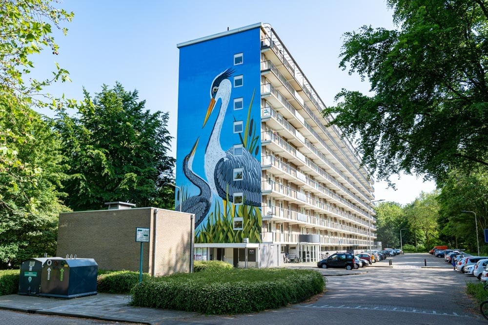 Ontdek de prachtige muurschildering reiger in Quirijnstok in Tilburg door kunstenaar Joep van Gassel