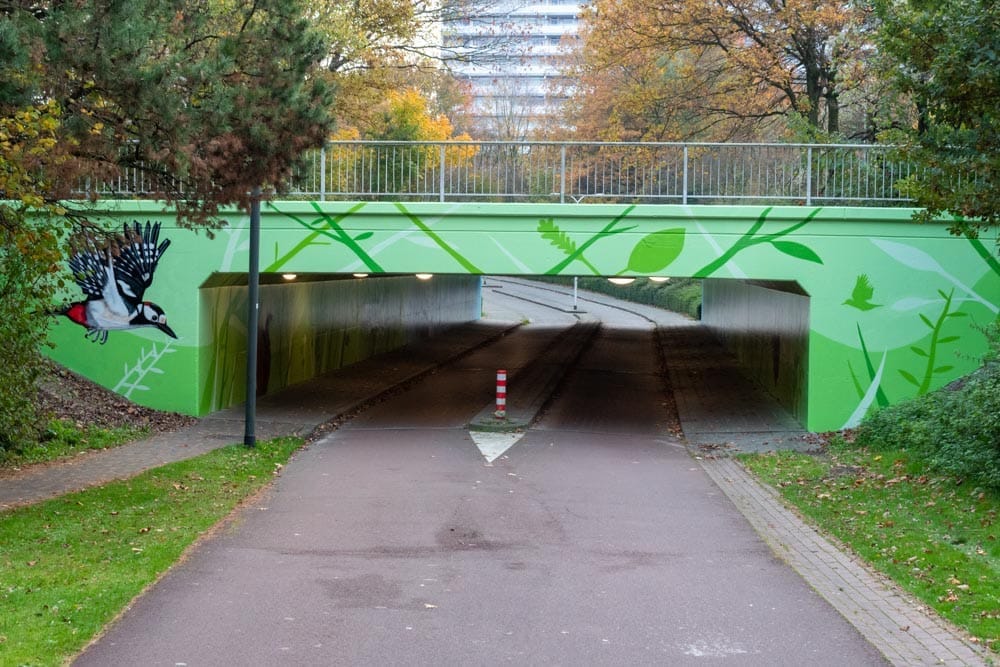 Dompel jezelf onder in de betoverende wereld van de Muurschildering Tunnel von Weberpad en ontdek de harmonie tussen kunst, natuur en de ondergrondse fietstunnel in Tilburg Noord. Laat je verrassen door de kleuren, vormen en verhalen die deze artistieke creatie met zich meebrengt terwijl je door de tunnel fietst en de lokale flora en fauna tot leven ziet komen op de muurschildering.