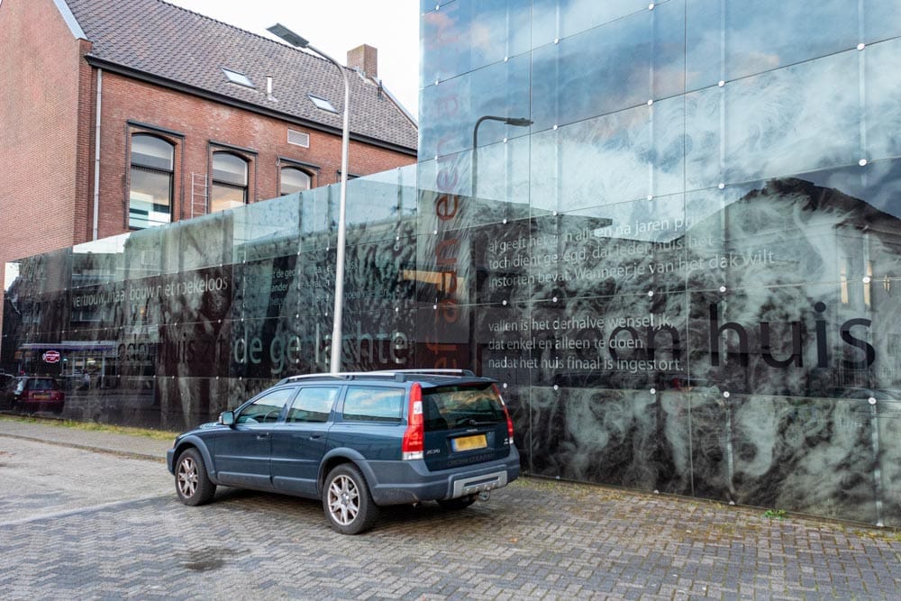 Plekgedicht Brief aan een architect is te vinden op een zijgevel van een pand van het Wilhelminapark in Tilburg en is van Luuk Gruwez.
