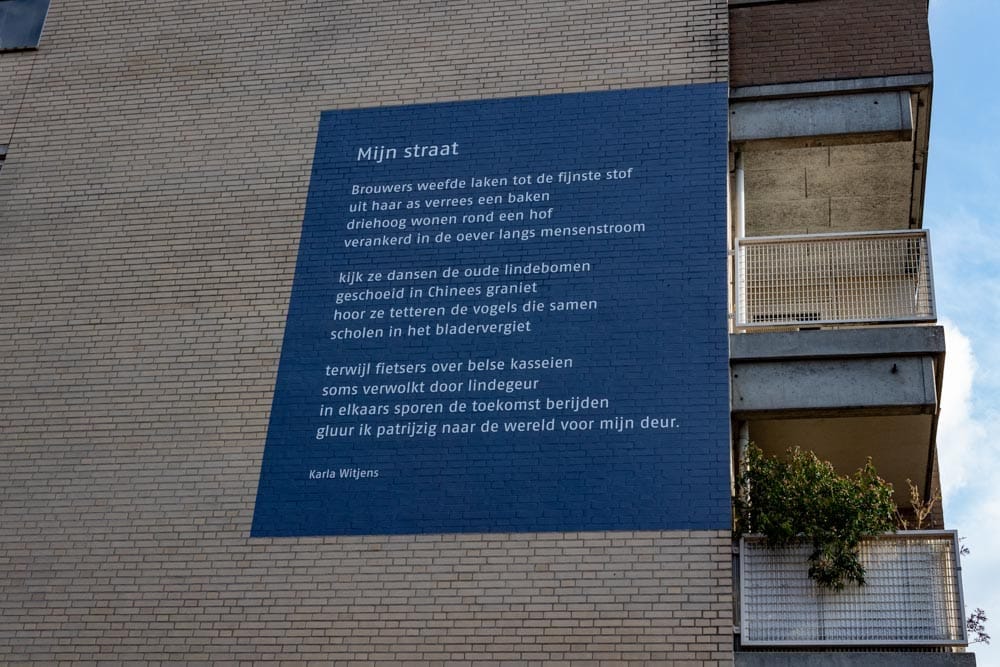 Het gedicht is met witte letters in een blauw kader op het appartementencomplex ‘Brouwerslaken’ aangebracht en is geplaatst tijdens de viering van het 25-jarig jubileum van het appartementencomplex.