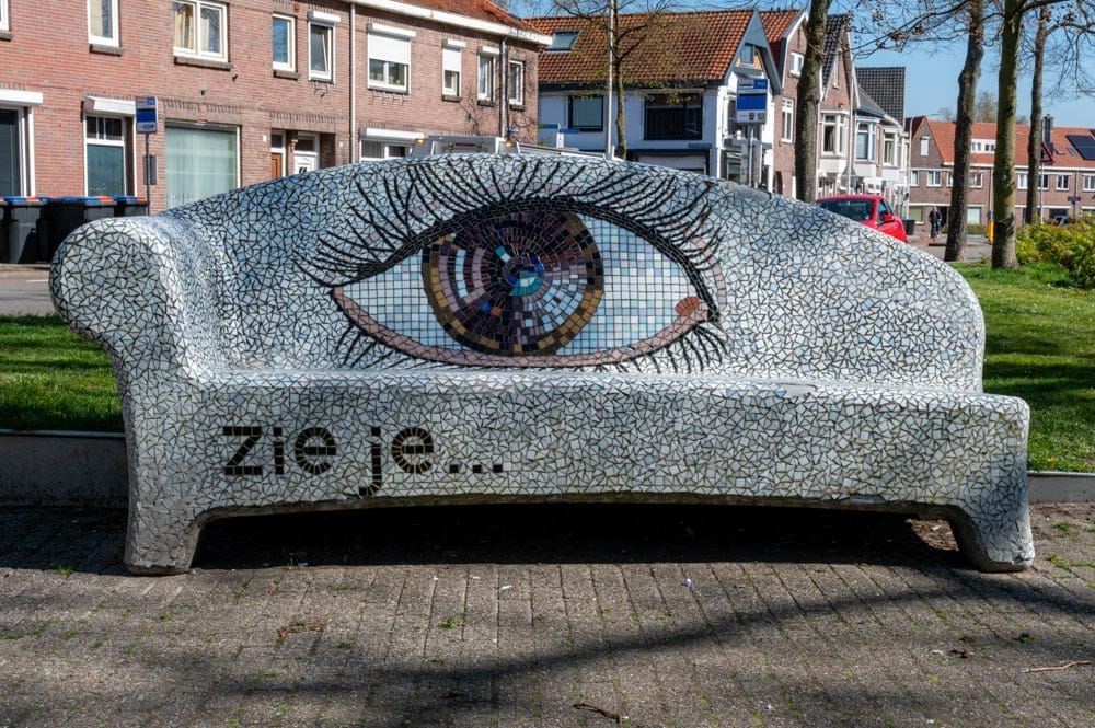 De Social Sofa Bekijks werd geplaatst op deze bijzondere locatie na 2008, nadat een ander bankje was verwijderd. Op de rugleuning van het bankje prijkt een imposant en intrigerend oog. Dit oog symboliseert de nieuwsgierigheid en de behoefte om de wereld om ons heen te observeren. Het nodigt voorbijgangers uit om even stil te staan, te reflecteren en de omgeving met een open blik te bekijken. Het oog op het bankje fungeert als een poort naar nieuwe perspectieven en ontdekkingen.