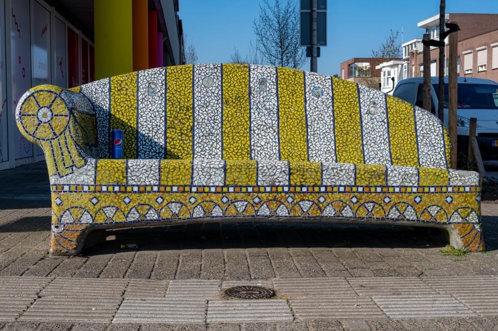 Het bankje is een waar visueel spektakel, waarbij gele en witte mozaïeksteentjes zorgvuldig zijn gebruikt om strakke vlakken te creëren die het geheel een eigentijdse uitstraling geven. De combinatie van de heldere gele tinten en het frisse wit maakt dit bankje een ware blikvanger in de buurt. Bovendien zijn er op het bankje ook ronde elementen te vinden, die zorgen voor een speels contrast en een dynamische uitstraling.