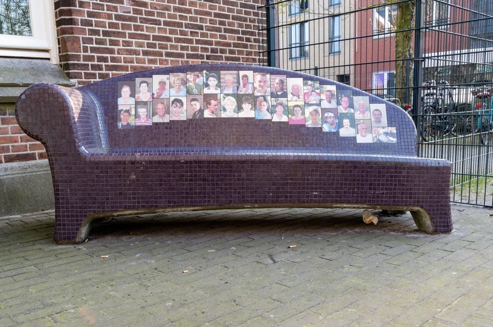 Dit unieke bankje is volledig bedekt met paarse mozaïeksteentjes, waardoor het een kleurrijke en levendige uitstraling heeft. Wat dit bankje echter echt bijzonder maakt, zijn de foto’s van diverse buurtbewoners die erop te vinden zijn. Elke foto toont het gezicht en de glimlach van een unieke persoon uit de wijk.