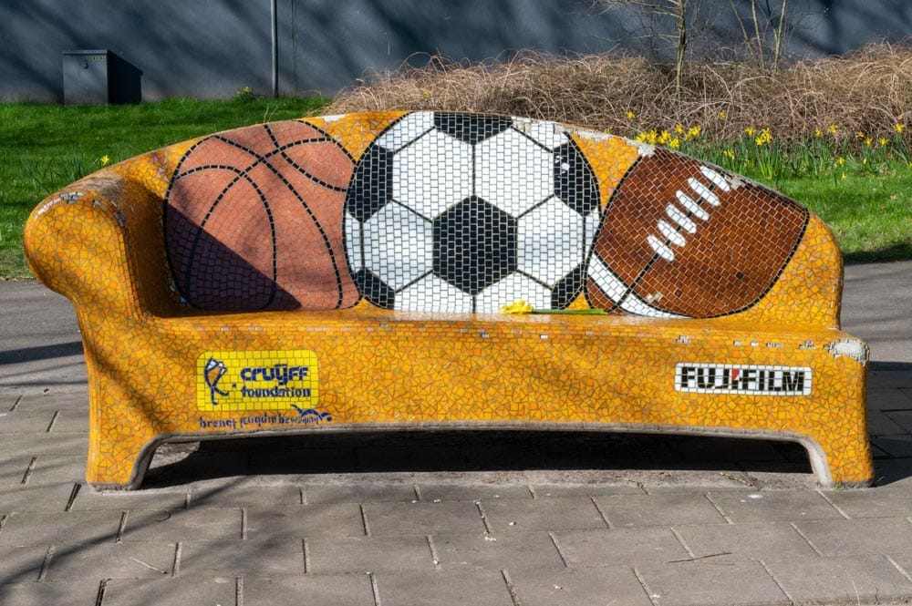 In 2011 onderging het bankje een grondige restauratie bij Cardan, waarbij alle pracht en praal werd hersteld. De rugleuning van het bankje is voorzien van een sublieme afbeelding van een basketbal, voetbal en een rugbybal, waarmee de veelzijdigheid en sportieve geest van de omgeving worden geëerd. Bovendien prijken op het bankje met trots het embleem van de Cruijff Foundation en het gerenommeerde merk Fujifilm.