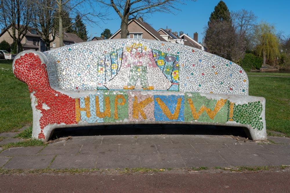 Dit kunstzinnige zitmeubel diende als een eerbetoon aan KVW De Blaak, een jaarlijks terugkerend evenement dat plaatsvindt op deze locatie in de wijk. Op de rugleuning van de bank was een prachtige afbeelding te bewonderen, waarin een figuur wordt weergegeven binnen een circustent. Bovendien zijn er mozaïeksteentjes in een opvallende oranje kleur gebruikt om de woorden “Hup KVW!” in te leggen.