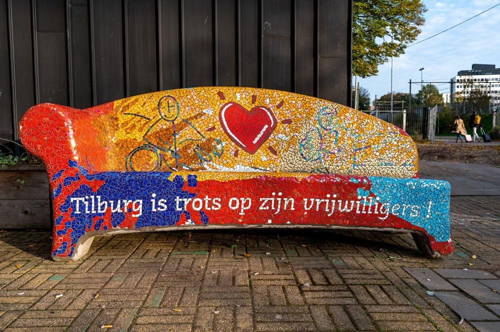 Deze kleurrijke sofa werd onthuld voor het station van Tilburg op 7 december 2009, een dag die jaarlijks wordt gevierd als de dag van de Vrijwilliger. Het bankje is bedoeld als eerbetoon aan alle vrijwilligers in de gemeente Tilburg. De onthulling werd uitgevoerd door Tanya Verduijn, een studente die zelf ook actief is in vrijwilligerswerk. Het initiatief voor deze social sofa kwam van de organisatie ContourdeTwern en de gemeente Tilburg. Op de rugleuning van het bankje zijn twee menselijke figuren te vinden, samen met een groot hart. Ook is de tekst “Tilburg is trots op zijn vrijwilligers” ingelegd met witte mozaïeksteentjes.