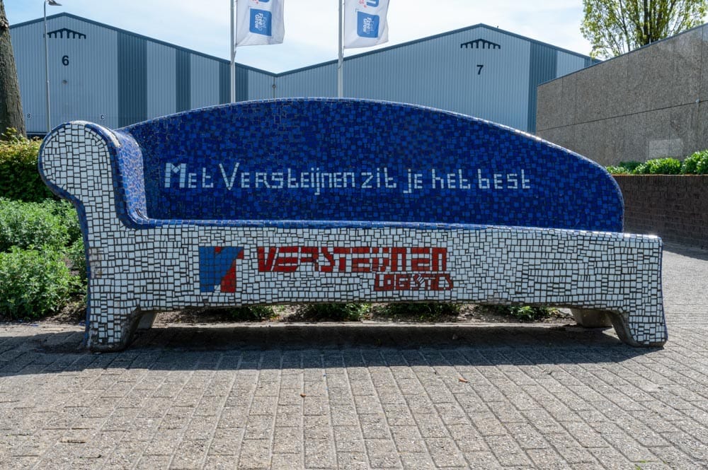 Bij Versteijnen Transport, gevestigd aan de Gesworenhoekseweg in Tilburg, kun je de Social Sofa Versteijnen Transport vinden. Dit bankje is uitgevoerd in de kleuren blauw en wit, en naast het Versteijnen Logistics-logo kun je op de rugleuning de tekst