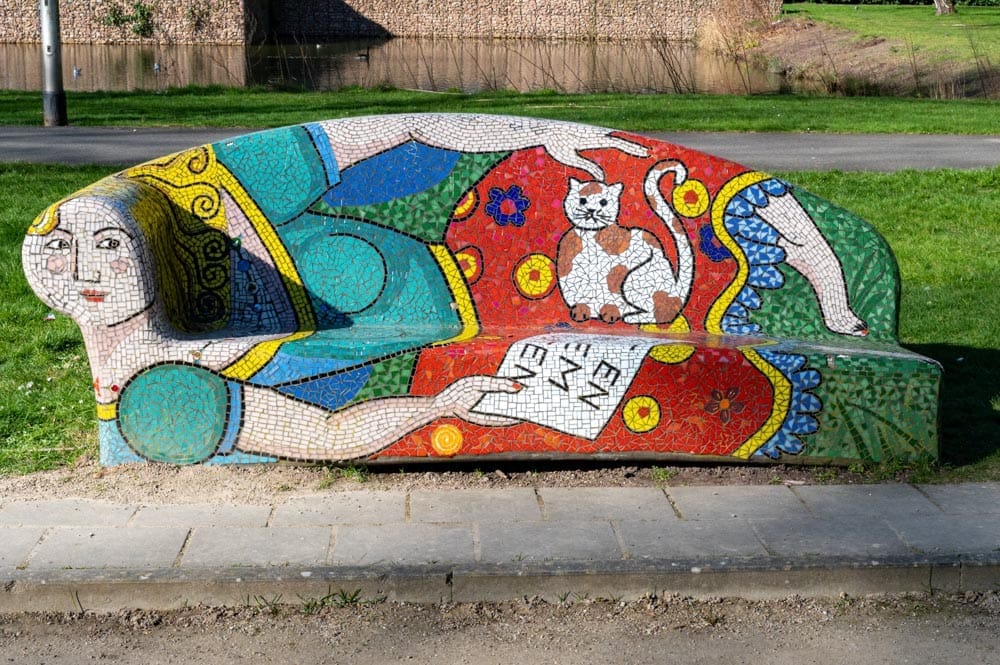 Op deze bijzondere bank is een afbeelding van een vrouwelijk figuur te zien, met een kat op haar schoot. Daarnaast houdt ze een papier vast met de woorden: