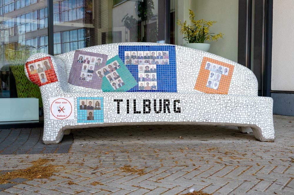 Dit unieke bankje bevat verschillende letters ‘T’, die verwijzen naar Tilburg. De ‘T’s zijn opgevuld met foto’s van personen, waardoor het bankje een persoonlijk tintje krijgt. Daarnaast is het woord ‘Tilburg’ met zwarte mozaïeksteentjes ingelegd, wat zorgt voor een mooi contrast. Deze bijzondere Social Sofa is een eyecatcher voor iedereen die het zorgcentrum bezoekt.
