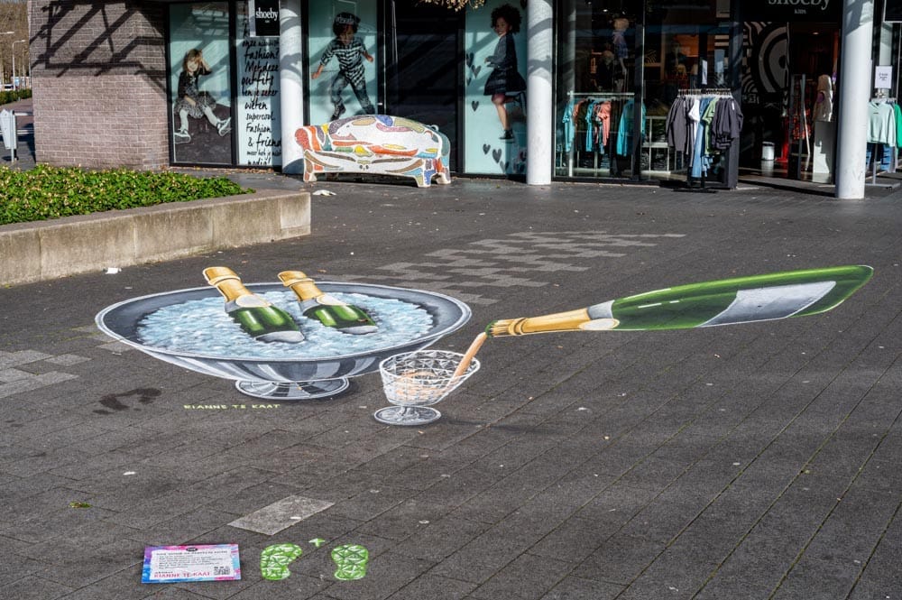 Streetart Champagnefles is te vinden op Winkelcentrum Heyhoef en is in 2022 geplaatst en is van de hand van Rianne te Kaat.